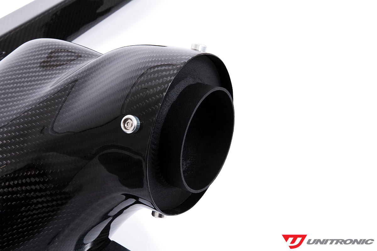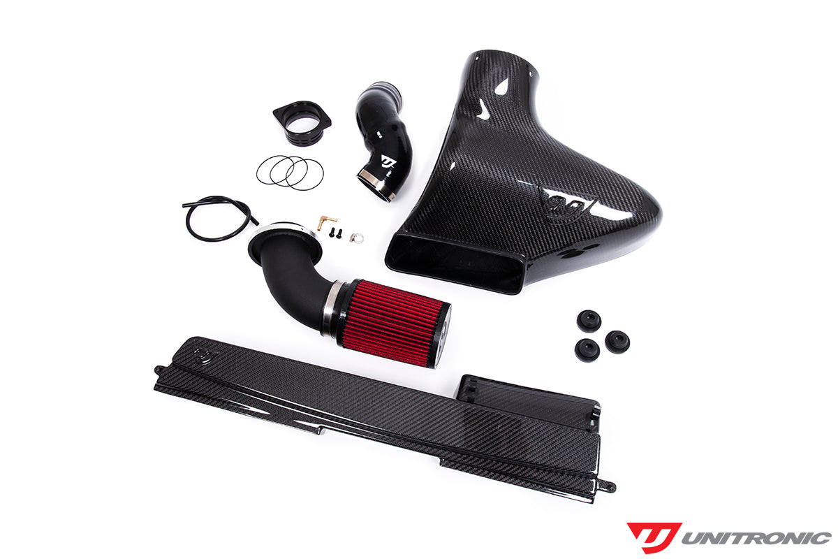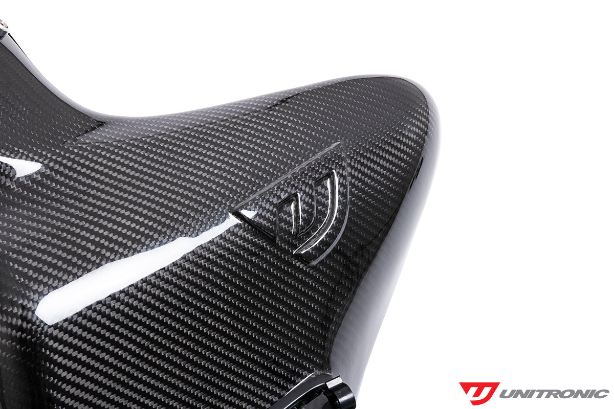 This translates into a complete Cold Air Intake System that is sure to perform to the maximum providing increased power air velocity and throttle response while also decreasing air intake temperatures and turbo lag. Unitronic's Carbon Fiber Air Duct also helps to increase power and air flow by taking advantage of both air inlets available in the OEM grill.