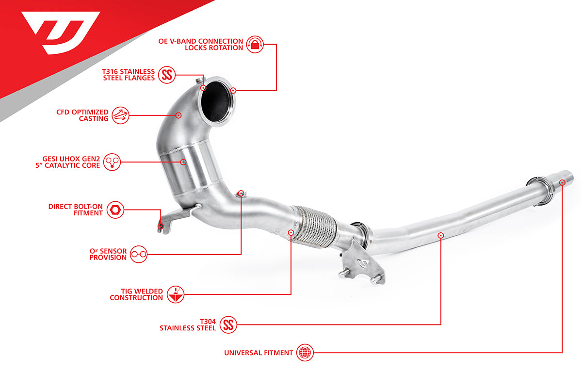 The Unitronic Performance Downpipe for the MK8 Golf R® and 8Y S3® equipped with the 2.0TSI EA888 EVO4 engine is a direct bolt-on upgrade designed to optimally eliminate unwanted restrictions in the factory downpipe reduce turbo lag and enhance the exhaust note. It utilizes a 5? 400cpsi ultra high output (UHOX) catalytic converter designed in partnership with Unitronic from our emissions partners at Global Emissions Systems Inc (GESi).